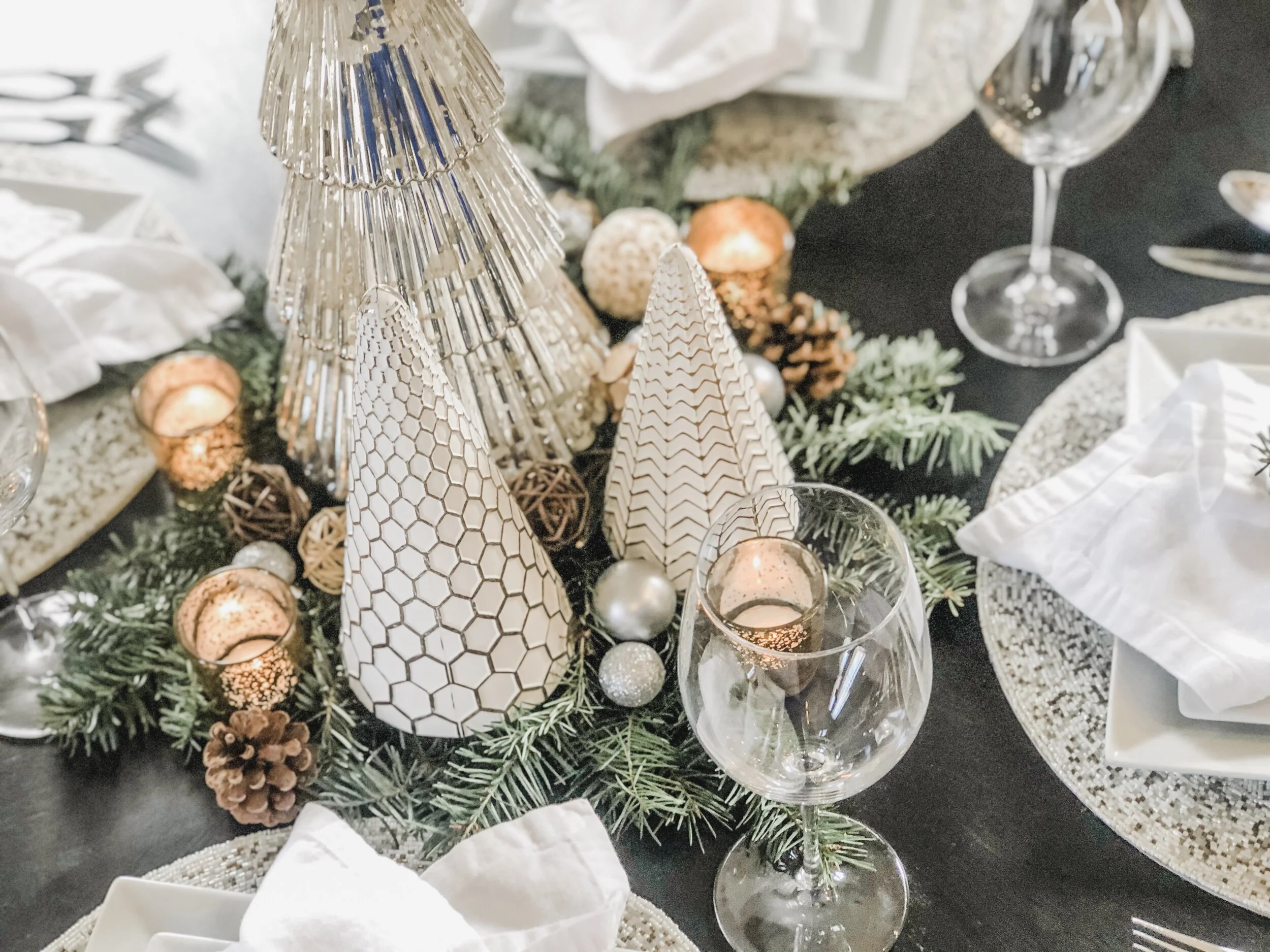 Our first table setting we used three neutral Christmas trees as our centerpiece. Our second tablescape we used, already-owned, DIY birch candlesticks - both simple and affordable objects.